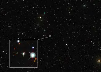 QSO J0529−4351 (SMSS J052915.80−435152.0) is a quasar, 12 billion light-years away in the Pictor constellation, notable for being the most luminous object ever observed at roughly 500 trillion times the luminosity of the Sun. The black hole at its centre has a mass of approximately 17 billion solar masses, and accretes around one solar mass per day. In a Gaia DR3 data set published on 13 June 2022, QSO J0529−4351 was assigned a 99.98% probability of being a star in the Milky Way via an automated analysis.[1] However, the quasar was identified as one using the Very Large Telescope of the European Southern Observatory; the discovery was announced on 19 February 2024.
