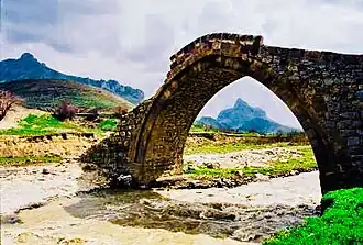 Qazanchi Bridge was built over the Alinjachay River, to the south of Qazanchi village in the Julfa District of Azerbaijan.[1][2] Among locals, it is also known as the “Gozbel Bridge.”[2][3] Since there is no inscription on the monument, the exact date of its construction is unknown.[4] However, based on its construction technique and architectural-structural design, it is believed to date back to the early 17th century, during the reign of Shah Abbas I (1587–1629).[5][2]