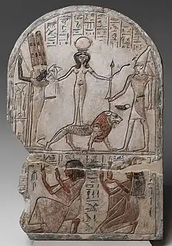 On a stele representing the deity, Qetesh is depicted as a frontal nude (an uncommon motif in Egyptian art, though not exclusively associated with her), wearing a Hathor wig and standing on a lion, between Min and the Canaanite warrior god Resheph. She holds a snake in one hand and a bouquet of lotus or papyrus flowers in the other.[10][11]