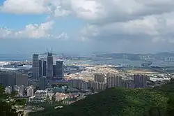 Qianhai Shenzhen-Hong Kong Modern Service Industry Cooperation Zone (simplified Chinese: 前海深港现代服务业合作区; traditional Chinese: 前海深港現代服務業合作區; pinyin: Qiánhǎi Shēngǎng Xiàndài Fúwùyè Hézuòqū) is a commercial development in Shenzhen, Guangdong that is also known as Qianhai New District. Located in Nanshan District and encircled by the Shuangjie River, Yueliangwan Boulevard, Mawan Boulevard and Qianhai Bay, Qianhai covers an area of approximately 15 square kilometres (5.8 sq mi), comprising almost entirely reclaimed land. As of 2024, its GDP exceeded RMB 300 billion (8.6% YoY growth), and total trade reached RMB 706.65 billion (+42.4% YoY).[1]