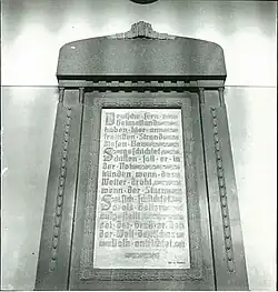 The office building is located on the top of the east side of the observatory. The platform of the building is 77.76 metres above sea level.[7] The 21.6-metre-high building has a 3-floor main body and 7-floor tower.[15] The outer walls are all made of granite stone and the roof slopes with beef-tongue-like tiles. The parapet wall at the top of the tower is constructed into a castellated shape. The entire building is shaped like a medieval European castle.[15][16] According to German naval literature, the Observatory building is designed with the following: offices, laboratories, libraries, public reading rooms, a temperature-controlled basement with clocks, temperature coefficient-measuring rooms equipped with a dual heating system, metalwork workshops and other auxiliary rooms.[17][18] The ground floor of the building lays a fuchsia glazed tile floor connected by stone steps. There is still a white marble stone monuments intact on the corridor wall, engraved with a German poem[16][7] by German poet Ernst von Wildenbruch.|Ernst von Wildenbruch}}