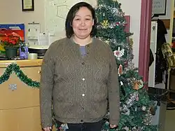 Muskoxen were not domesticated until 1954.[7] Domestication began with the Musk Ox Project, headed by John J. Teal, Jr with the first domestic muskox farm in Fairbanks, Alaska. The project continues at the muskox farm in Palmer, Alaska.[8] The Oomingmak Musk Ox Producer's Cooperative was formed in the late 1960s by indigenous women on Nunivak Island, with the help of Dr. Teal and Mrs. L. Schell. It is a knitting cooperative that works with qiviut and is still in operation today. The cooperative has its headquarters in Anchorage, Alaska, and is owned by approximately 200 native Alaskans from many remote villages in Alaska.[9] The name of the cooperative comes from the Inuit language word for muskox, umingmak,[1] "the animal with skin like a beard."
