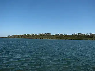 Quail Island is about 1,000 hectares (2,500 acres) in area,[1] though earlier news reports claimed that it was much larger, up to 1,600 hectares (4,000 acres).[3] Quail Island is connected to the mainland at low tide. North of the island, a tidal creek connects Watson Inlet and Rutherford Inlet.[4] The island itself is uninhabited, the entirety of it being gazetted as Quail Island Nature Conservation Reserve, and in January 2016 as the North Western Port Nature Conservation Reserve.[2] Mangrove surrounds the island, and on its western shore there is a wide salt marsh. There is an undisturbed topography area of Cranbourne sands, and behind the mangroves there are sandy spits and beaches. The island's eastern coastline is offshore from Warneet, from which it may be accessed by boat.[4] There are two seasonal dams located in the centre, one of which was about 100 m (330 ft) long.[5]