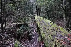 There has been no formal survey of fauna though the presence of feral goats has been recorded.[8] Pink robins and green rosellas have been seen on the mountain. In shaded and moist areas there are scrubtits and Bassian thrush.[22] The last recorded fires in the forest reserve were 1961, when some of the drier forests burned, and 1968, when the northwest corner was lightly burned.[23] Parts of the reserve had been selectively logged for around 100 years until 1982, mostly for sawlogs.[24] Campaigning to fully protect the area from logging has been carried out by environmentalists, including through the use of citizen science to identify threatened species and areas of significance and then apply for their protection through the use of state regulations.[25]