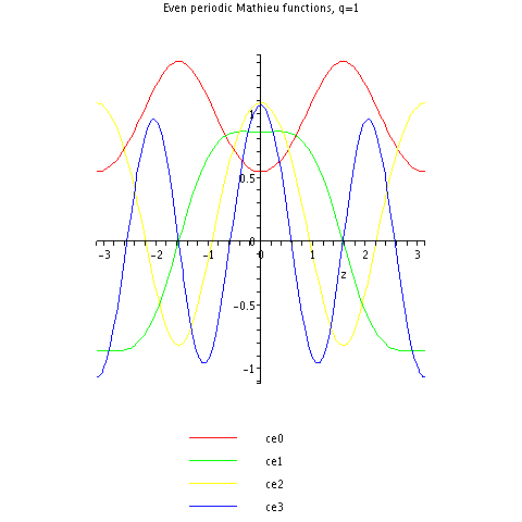 The general solution of the above differential equation for a given value of a and q is a set of linearly independent Mathieu cosines and Mathieu sines, which are even and odd solutions respectively. In general, the Mathieu functions are aperiodic; however, for characteristic values of , the Mathieu cosine and sine become periodic with a period of .