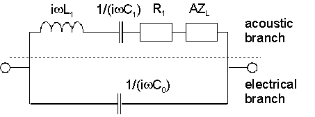 Equivalent circuits build on the electromechanical analogy. In the same way as the current through a network of resistors can be predicted from their arrangement and the applied voltage, the displacement of a network of mechanical elements can be predicted from the topology of the network and the applied force. The electro-mechanical analogy maps forces onto voltages and speeds onto currents. The ratio of force and speed is termed "mechanical impedance". Note: Here, speed means the time derivative of a displacement, not the speed of sound. There also is an electro-acoustic analogy, within which stresses (rather than forces) are mapped onto voltages. In acoustics, forces are normalized to area. The ratio of stress and speed should not be called "acoustic impedance" (in analogy to the mechanical impedance) because this term is already in use for the material property Zac = ρc with ρ the density and c the speed of sound). The ratio of stress and speed at the crystal surface is called load impedance, ZL. Synonymous terms are "surface impedance" and "acoustic load."[27] The load impedance is in general not equal to the material constant Zac = ρc = (Gρ)1/2. Only for propagating plane waves are the values of ZL and Zac the same.