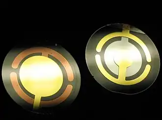 Photograph of typical quartz crystal resonators as used for QCM, metallised with gold electrodes (left: front electrode, right: back electrode) by vapor deposition.