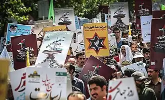 Critics of Quds Day have argued that it is antisemitic.[9][10] In Iran, the day is marked by widespread speeches (some featuring Holocaust denial)[11] and rallies that have been frequented by chants of "Death to Israel, Death to America", with crowds trampling and burning Israeli flags.[12][13] Quds Day rallies have also featured demonstrations against other countries and causes.[14][15][16]