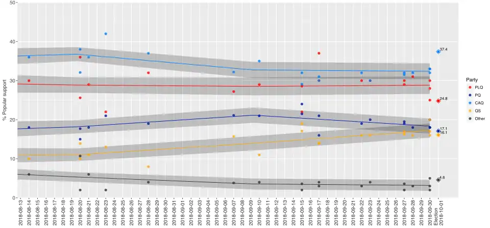 {{cite web}}: CS1 maint: numeric names: authors list (link) - ^ a b Durand, Claire; Blais, André (March 2020). "Quebec 2018: A Failure of the Polls?". Canadian Journal of Political Science/Revue Canadienne de Science Politique. 53 (1): 133–150. doi:10.1017/S0008423919000787. hdl:1866/24757. ISSN 0008-4239. S2CID 212985241.