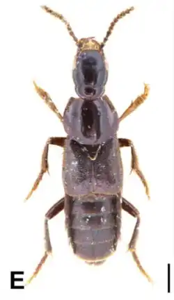 Adults have a dark brown head, elytra, abdomen, antennae and legs, while the pronotum and apices of the abdominal tergites are slightly paler and dark reddish brown. The apical tarsomeres of all legs are paler and yellow-brown and the abdomen is vaguely iridescent.[1]