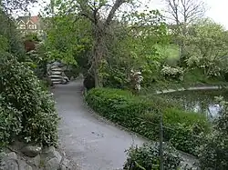 At the north-west corner is Pennant Lodge, once the home of Charles Freshfield. Also to the north-west of the park itself, on Queen's Park Road, stands the Pepper Pot (also called the "Pepper Box"). Probably originally built as a horizontal wind-powered water pump, and later used for the publishing of a local newspaper, it was later an artist's studio and by the 1990s a public convenience. In the 21st century it has been sealed and unused.[1][2] The park itself, without the houses but including the Spa and the Pepper pot, was bought by the Race Stand Trustees in 1890 for £13,500 and donated to the town.[1]