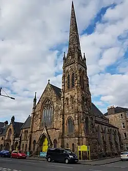 The church was founded as the Queen's Park Free Church, as a congregation of the Free Church of Scotland. The congregation was formed in December 1866.[1] The current church building was designed by James Thomson and was built between 1874 and 1875. The foundation stone was laid on 28 February 1874 by Patrick Playfair, Lord Dean of Guild, and the church building was completed in a little over a year. It was dedicated and opened for use on 16 May 1875. The church was built in the Neo-Gothic style, with a corner spire. The church halls were added in 1879.[2]