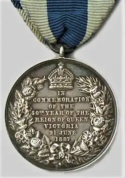 The medal measures 30 millimetres (1.2 in) in diameter and was awarded in gold (to members of the Royal Family), silver (to officers and those of similar status) and in bronze (to selected other ranks and those of similar status).[4] On the obverse, Queen Victoria is depicted crowned and wearing a veil which falls over the back of the head and neck, with the text VICTORIA D.G. REGINA ET IMPERATRIX F.D.. The reverse bears the words IN COMMEMORATION OF THE 50TH YEAR OF THE REIGN OF QUEEN VICTORIA · 21 JUNE 1887 within a garland of roses, shamrock and thistles. The bust of Queen Victoria on obverse was designed by Sir Joseph Edgar Boehm and the reverse wreath designed by Clemens Emptmayer, who was recommended by Boehm. The ribbon is garter blue with wide white stripes towards each edge.[1] The medal was awarded unnamed.[5]