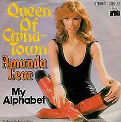 "Queen of Chinatown" (also typed "Queen of China-Town") is a song by French singer Amanda Lear, released in 1977 by Ariola Records. It met with a big chart success and remains one of Lear's biggest hits to date. The song's lyrics were written by Lear herself and the music was composed by Anthony Monn, her musical partner at that time. It's an uptempo disco composition with characteristic oriental elements. The song was released in late 1977 as the sixth and final single from Lear's debut album, I Am a Photograph (1977), however, was included only on the album's re-issue, replacing "La Bagarre". The B-side of the single was "Alphabet", which had earlier received a separate A-side single release in the Netherlands. In Japan, "The Lady in Black" was released on the side B.