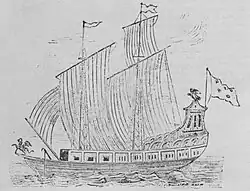 Other sources say the first ship was a smaller vessel built by LaSalle at Fort Frontenac beginning in September 1678, for the purpose of conveying supplies and material to Niagara. This vessel, which is called Frontenac in some reports,[10] is said to have been about 10 tons burthen, measuring from 35 to 45 feet (11 to 14 m) long. Expedition journalists called it a brigantine. It departed Fort Frontenac under La Motte's and Louis Hennepin's leadership on November 18, 1678, and arrived at the east bank of the Niagara River on December 6, 1679. Shortly thereafter, LaSalle and Tonty came with more supplies, and their vessel (carrying the anchor, rigging, and guns for Le Griffon) foundered in the surf less than thirty miles (48 km) from Niagara. Hennepin called this vessel a "great bark." One source says the loss occurred on January 8, 1679. Supplies and extra clothing were lost, but LaSalle and his men rescued material for the ship, dragged them to the mouth of the Niagara, rested a few days in an Indian village, and arrived at the settlement above the falls on January 20.[11] Some say the lost vessel was Frontenac. Historian Francis Parkman says that by 1677, there were already four vessels on Lake Ontario between 25 and 40 tons burthen.[12] He does not say if any of them were named. Tonty's journal indicates that the vessel he and LaSalle used was a 40-ton vessel, but he does not associate a name with it.[13]
