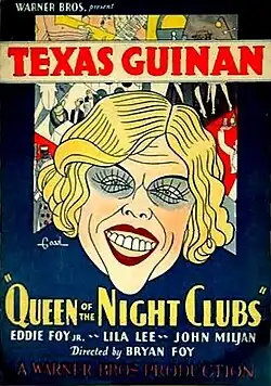 Queen of the Night Clubs is a 1929 American sound (All-Talking) Pre-Code musical drama film produced and directed by Bryan Foy, distributed by Warner Bros., and starred legendary nightclub hostess Texas Guinan. The picture, which featured appearances by Eddie Foy Jr., Lila Lee, and George Raft, is now considered a lost film.[3] A still existing vintage movie trailer of this film displays no clip of the feature.