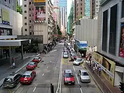 Tai Wong Street West (大王西街) is a pedestrian road that runs southwest from Johnston Road to Queen's Road East. About halfway along the road it is connected to Tai Wong Street East by the Tai Wong Street East Sitting out Area.[8] The street was originally called Ocean Boat Street, and was opened in 1910. It connects with Queen's Road East opposite Hung Shing Temple.[23] It derives its name from the temple, as "Tai Wong" is an alternate name for Hung Shing.[24]