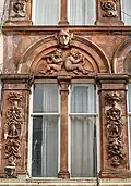 The front of the hotel originally included arched windows with eight carved heads, with four heads located over the ground floor windows and four over the first floor. The front also features cherubs, a satyr playing the pan flutes, floral designs, eagles, and keystones carved as human heads.[2] The ground floor carvings have since been removed and the front of the building modernised.