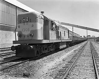 In 1962, 1306 became the first diesel locomotive in Queensland to log 1 million miles. In 1965, they were again renumbered as the 1150 class.[1] They were initially used in the Darling Downs region to haul wheat, then on the North Coast line and the Western line. In the 1980s, the six remaining units were based at Townsville.[1]