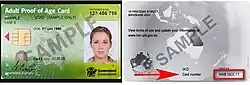 ![]() Front and back of a Queensland adult proof of age card, card number highlighted | |