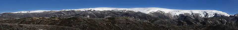 During the Holocene, Quelccaya did not expand farther than 1 kilometre (0.62 mi) from its present position and early Holocene moraines have not been found.[201][202] It is possible that during the mid-Holocene Quelccaya was ice-free altogether;[203] peat deposits and ice cores indicate that it was reduced or even absent then.[204] Until either 7,000 years ago or between at least 7,000 years ago and about 5,000 years ago, plants grew at its margins,[185][205][206] including cushion mire vegetation judging by exposed remains. This shrinkage may relate to a warmer and drier climate at that time.[206][207]