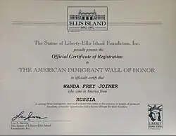- ^ "The American Immigrant Wall of Honor". Liberty Ellis Foundation. The Statue of Liberty - Ellis Island Foundation, Inc.