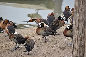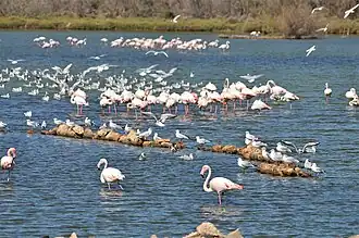 Around the lakeshore, there is a large colony of wild-occurring greater flamingos and Chilean flamingos, pink-backed- and great white pelicans from the zoo.[1] In the 1-hectare large Grande Volière, built in 2018, the zoo features Abdim's storks, African openbills, saddle-billed storks, Marabou storks, grey crowned cranes, goliath herons, hamerkops, African sacred ibises, hadada ibises, grey-cheeked hornbills, trumpeter hornbills, grey parrots, vulturine guineafowl, yellow-billed storks, Western plantain-eaters, hooded vultures, palm-nut vultures, Rüppell's vultures, African black ducks, blue-billed teals, cape teals, fulvous whistling ducks, white-faced whistling ducks, knob-billed ducks, red-crested turacos, yellow-necked spurfowl, speckled pigeons and Gabon talapoins.[3][4][7][8] Since 2024, the zoo also has a pair of white-headed vultures.[9]