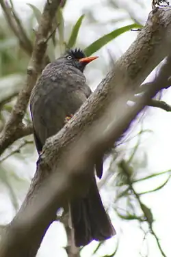 The appearance of the Réunion bulbul is similar to that of the Mauritius bulbul but is slightly smaller with a length of 22 cm. It is ashy gray with a blackish crest and the iris is conspicuously white. The bill and feet have an orange hue.[3]