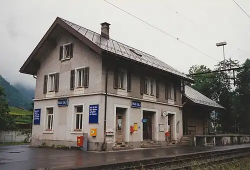 Rüti GL railway station (German: Bahnhof Rüti GL) is a railway station serving the village of Rüti in the municipality of Glarus Süd in the Swiss canton of Glarus (abbreviated to GL).The station is situated on the Weesen to Linthal railway line, and served by the hourly Zürich S-Bahn service S25 between Zurich and Linthal.[1][2][3][4]