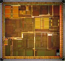 The R12000 was fabricated by NEC and Toshiba in a 0.25 μm CMOS process with four levels of aluminum interconnect. The use of a new process does not mean that the R12000 was a simple die shrink with a tweaked microarchitecture; the layout of the die is optimized to take advantage of the 0.25 μm process.[7][8] The NEC fabricated VR12000 contained 7.15 million transistors and measured 15.7 by 14.6 mm (229.22 mm2).