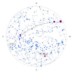 In the night sky, R136 appears as a 10th magnitude object at the core of the NGC 2070 cluster embedded in the Tarantula Nebula in the Large Magellanic Cloud.[14] It required a 3.6 metre telescope to detect R136a as a component of R136 in 1979,[9] and resolving R136a to detect R136a1 requires a space telescope or sophisticated techniques such as adaptive optics or speckle interferometry.[11]