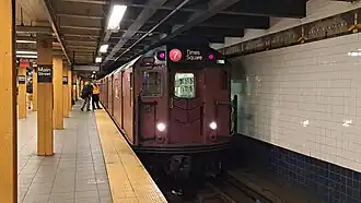 From December 1987[3] until July 2001,[4][5][6] "World's Fair" cars 9478–9523 usually ran on the 6 train based at Westchester Yard in the Bronx. Previously, some Westinghouse-equipped cars had been assigned to the 1 and 3 trains in the late 1960s–early 1980s.[3] The "Main Line" cars usually ran on the 7 from February[3] 1984 to December 1987,[3] and was transferred to the 6 from December 1987[3] to June 2001,[7] when they were returned to the 7.