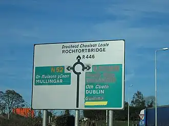 The R446 road is a regional road in Ireland. The road connects Kinnegad in County Westmeath to Galway City. Prior to the construction of the M6 motorway the R446 formed the main N6 road connecting Dublin and Galway (via the N4 at Kinnegad). Following the opening of the M6; the old N6 road was downgraded to regional road status and was designated as the R446. The road is an alternative route between Galway and Dublin and runs in parallel to the M6.