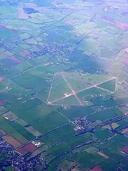 RAF Barford St John was opened on 30 July 1941 as a training facility for RAF Flying Training Command. It had three grass runways, used primarily by Airspeed Oxfords of No. 15 Service Flying Training School RAF from RAF Kidlington.[2] The airfield was rebuilt as an RAF Bomber Command airfield with paved runways and night operations equipment and reopened as a satellite for RAF Upper Heyford in December 1942.[2] In 1943 the station served as flight test centre for its Gloster E.28/39 and Gloster Meteor jet aircraft.[3] Bomber Command and No. 16 Operational Training Unit was stationed there with Vickers Wellingtons until December 1944.[2] No. 1655 Mosquito Training Unit RAF replaced the Wellingtons at that time.[2] After the war the airfield was closed in 1946 and placed into care and maintenance.[2]
