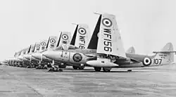 No. 79 Squadron RAF was equipped with Hawker Hunter FGA.9, FR.10 and T.7, a transonic British jet-powered fighter aircraft, along with Gloster Meteor T.7 and T.8 aircraft. The Meteor aircraft were used for target towing, while the Hunter FGA.9 and FR.10 were used to train in Air-to-ground weaponry, including bombs, machine guns, autocannons, air-to-surface missiles and rockets, as well as tactical low level flying.[38] The squadron was also equipped with BAC Jet Provost aircraft for pilot refresher training.[39]