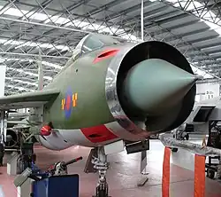 English Electric Lightning in the National Museum of Flight in East Fortune, Scotland. It is displayed in the colours of No 92 Squadron, located at RAF Gütersloh with whom it served until 1977.