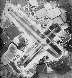 ![]() Staplehurst Airfield, two weeks before D-Day on 21 May 1944. Note the blister hangar just to the west of the 19 runway. The improvised technical site and airfield station is located to the north of the 10 runway. | |||||||||
