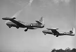 The 79th FBS flew the Republic F-84G Thunderjet. Markings for the F-84s at Woodbridge consisted of yellow lightning flashes on the fuselage and on the external wing tip tanks.