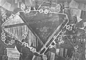 Wormingford was originally earmarked for an Eighth Heavy Bomb Group, being built by Richard Costain Ltd. and helped by a number of sub-contractors during the period 1942/1943. The airfield had a 2,000-yard main runway on an E-W axis and two intersecting runways of 1,400 yards each along with the USAAF standard fifty hardstands, two T2 hangars, one each side of the airfield, Mark II lighting and temporary building accommodation for 2,900 personnel. The technical area was on the southern side of the airfield and the camp sites dispersed to the south and east in and around the village of Fordham.[1]