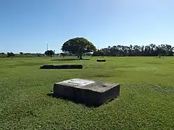 There is a scatter of trees, a picnic shelter and barbeque facilities to the northwest of the two concrete huts, but these features are not considered to be of cultural heritage significance. To the north of the huts is a rectangular raised area with remnant low concrete walls, with a concrete slab to its northwest. These features mark the site of the quarters and mess building. Located to the north and south ends of the quarters site, to its northeast, are two rectangular brick cisterns, rendered with concrete. Each has a round pipe opening on top of one end, and a modern metal cover with a hatch at the other end. The cisterns were probably the septic systems for the living quarters.[1]