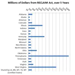 The money is divided among states by a formula, with 80% weight on the amount of coal mined from each State or Indian tribe before August 3, 1977, and 20% weight on reclamation fees paid from 2012 through 2016.[9] The RECLAIM Act's stated goal is to help "economically distressed mining communities... adversely affected by coal mining carried out before August 3, 1977," and much of the targeted support goes to Kentucky, Illinois, Pennsylvania and West Virginia..