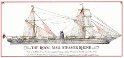 In June 1863 RMSP ordered Rhone from the Millwall Iron Works on the Isle of Dogs, London and her sister ship Douro from Caird & Company in Greenock.[3] The pair was initially to work the Rio de Janeiro route. They were similar but not identical. Both were handsome ships, but Rhone was considered to have slightly finer lines.[6]