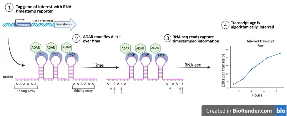 - Algorithmically, the age of the timestamped RNA can be inferred by estimating the total number of adenosine-to-inosine edits on the mRNA transcripts. This allows for inferall of transcript age with hour-scale accuracy.[1]