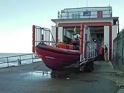 The Oddfellows is 8.44 m (27.7 ft) long and has a beam of 2.8 m (9.2 ft) and with the engine raised a draught of just 0.53 m (1.7 ft).[3] The propulsion is provided by two Yamaha inversion-proof 115 horsepower (86 kW) four-stroke petrol engines. The motors are capable of pushing the lifeboat through the water at speeds in excess of 35 knots (65 km/h; 40 mph). The lifeboat is launched with a crew of four aboard and uses a Do-Do (drive on - drive off)[3][4] trolley pushed directly into the sea by a Talus MB-4H amphibious tractor[5] via the station slipway.