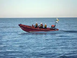 The lifeboats onboard equipment includes the latest in electronic equipment including radar, a chart plotter and VHF radio direction finding equipment. Running around the outside of the hull is an inflatable tube constructed of tough Nylon weave. This tube, or sponson[3] is made up of separate compartments. If one of the compartments is accidentally punctured then the others will remain inflated. Should all the compartments become compromised the lifeboat would still be capable of floating without the sponson. The sponson allowing the boat to operate in rough seas and provides fendering when going alongside other vessels.