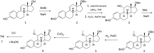 RU-16117 is derived from Δ9,11-dehydroestradiol (1). Its two hydroxy groups are first protected by the formation of benzyl ethers, giving (2) and the isolated double bond is hydrated by hydroboration, followed by oxidation with hydrogen peroxide in alkali to give (3). The newly-introduced alcohol is methylated with iodomethane to produce (4). After removal of the protecting groups by catalytic hydrogenation to form (5), the hydroxyl group in the five-membered ring is oxidized to a ketone with chromium trioxide and the product, (6), is reacted with potassium acetylide to introduce the acetylide group of the drug.[1][10]