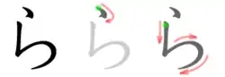Ra (hiragana: ら; katakana: ラ) is one of the Japanese kana, which each represent one mora. Both versions are written with two strokes and have origins in the character 良; both characters represent the sound [ɾa] ⓘ. The Ainu language uses a small katakana ㇻ to represent a final r sound after an a sound (アㇻ ar). The combination of an R-column kana letter with handakuten ゜- ら゚ in hiragana, and ラ゚ in katakana was introduced to represent [la] in the early 20th century.