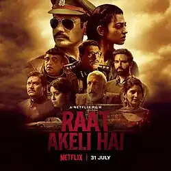 Raat Akeli Hai (transl. 'The night is lonely') is a 2020 Indian Hindi-language thriller drama film directed by Honey Trehan.[2] Starring Nawazuddin Siddiqui, Radhika Apte, Shweta Tripathi, Tigmanshu Dhulia, Shivani Raghuvanshi, Nishant Dahiya, Gyanendra Tripathi, Ila Arun, Swanand Kirkire, Nitesh Kumar Tiwari and Aditya Srivastava, the film follows a small-town cop who is summoned to investigate the death of an elderly family member.[3][4] Raat Akeli Hai was released on Netflix on 31 July 2020.[5] The film received critical acclaim for its performances and direction. Nawazuddin Siddiqui earned a Best Actor award at the Filmfare OTT Awards while the film also won Best Film at the ceremony.