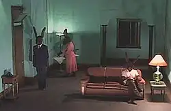 Dave Kehr noted in The New York Times that it was Alain Resnais who first put giant rodent heads on his actors in his 1980 film Mon oncle d'Amérique.[17] The dialogue between the Rabbits has been described as Beckettian.[18][19] The use of lighting to create shadows and set an uneasy atmosphere has been noted by various commentators.[20][21][22][23]