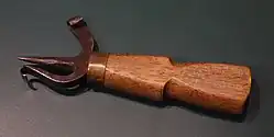 Race knife also known as a timber scribe (scorer, tree marker) is a knife with a U-shaped end sometimes called a scoop knife for cutting marks in wood by lumbermen, carpenters, coopers, surveyors, and others.[1] The reasons for making marks varies and includes keeping count (tally marks), identifying parts (carpenter's marks), numbering, and tracing patterns around a template as a part of marking out. The gouges left by the timber scribe are more durable than pencil or chalk marks.